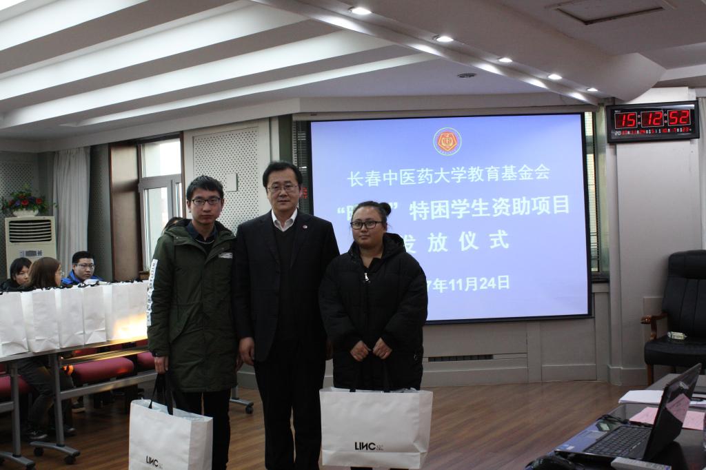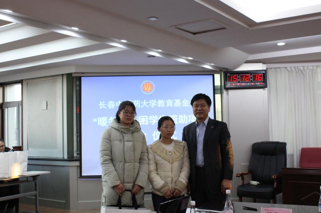 校长宋柏林,党委副书记、教育基金会理事长姜彤伟,教育基金会副理事长、北京火人医药及科技开发有限公司董事长孙飏,教育基金会副理事长、长春人民药业有限公司董事长许家顺,教育基金会副理事长、学校副总会计师兼计划财务处处长周艳秋,教育基金会理事、中国石油公司吉林石化松花湖疗养院院长于宏君分别为受助学生代表发放了资助棉衣。